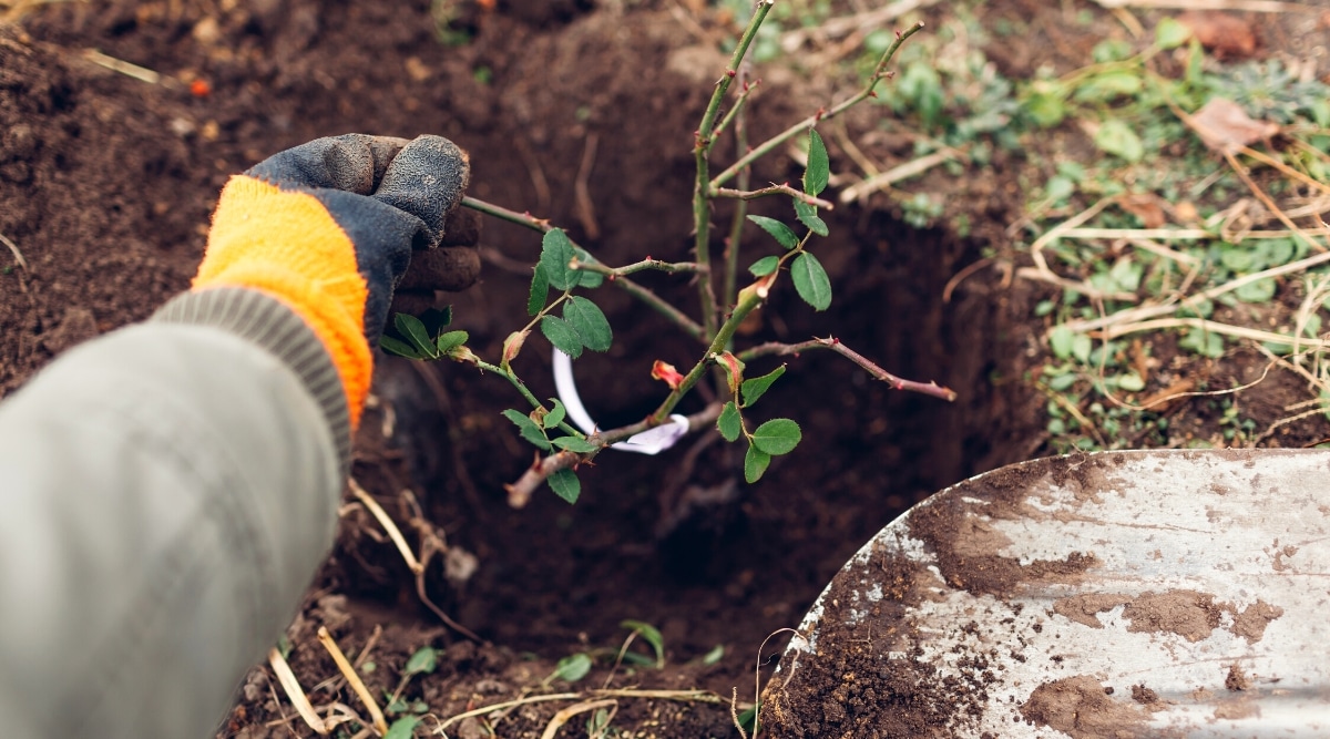 حفره ای به شکل نامنظم حفر کنید و شکاف ها و تونل های کوچکی را برای گسترش ریشه ها نیر قرار دهید . سوراخ باید ۲۰ سانت عمیق تر از اندازه ظرفی باشد که گل رز شما وارد آن شده است.