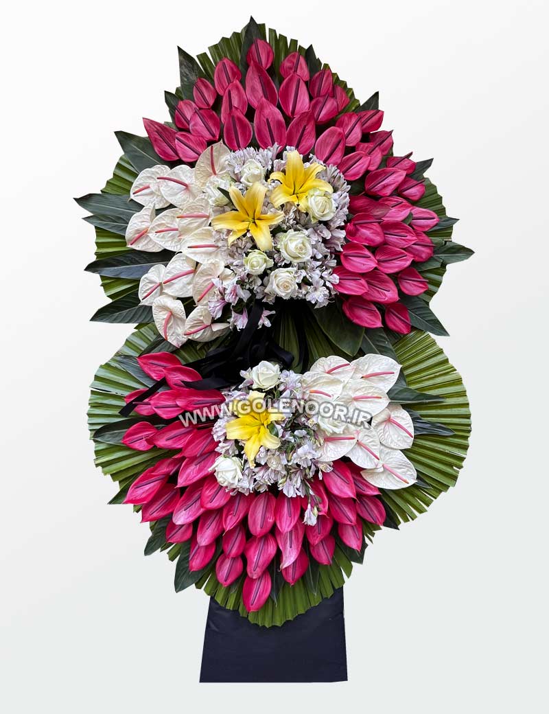 تاج گل دوطبقه آنتوریوم بنفش ترحیم دارای اندازه ۲۳۰ سانتی متر و عرض ۸۰ سانتی متر است. گل های مورد استفاده در این تاج گل رز سفید ، آنتوریوم بنفش و سفید هستند. شما می توانید طرح و رنگی به سلیقه خودتان هنگام خرید برای این محصول درج کنید. این محصول با دیزان متفاوت و بروز علاقمندان بسیاری دارد و به شدت در بورس است.